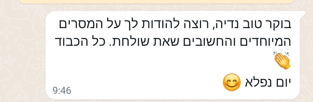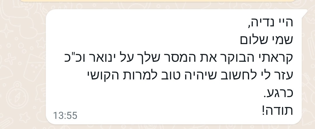 “נדיה יקרה, אני באמצע הליכה ותוך כדי עולים בי כל הדברים שמחוללים בי שינוי פנימי.