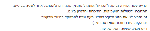 בדרך כלל אני לא כותבת תגובות, אבל חייבת להגיד שהיה כאן משהו מיוחד מאוד וזה הפתיע את שנינו כמה זה קירב אותנו.